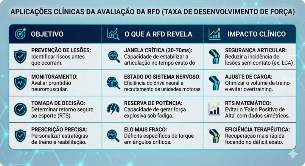 RFD é a velocidade de produção de força. Ela é essencial para prevenir lesões e avaliar a prontidão neuromuscular.